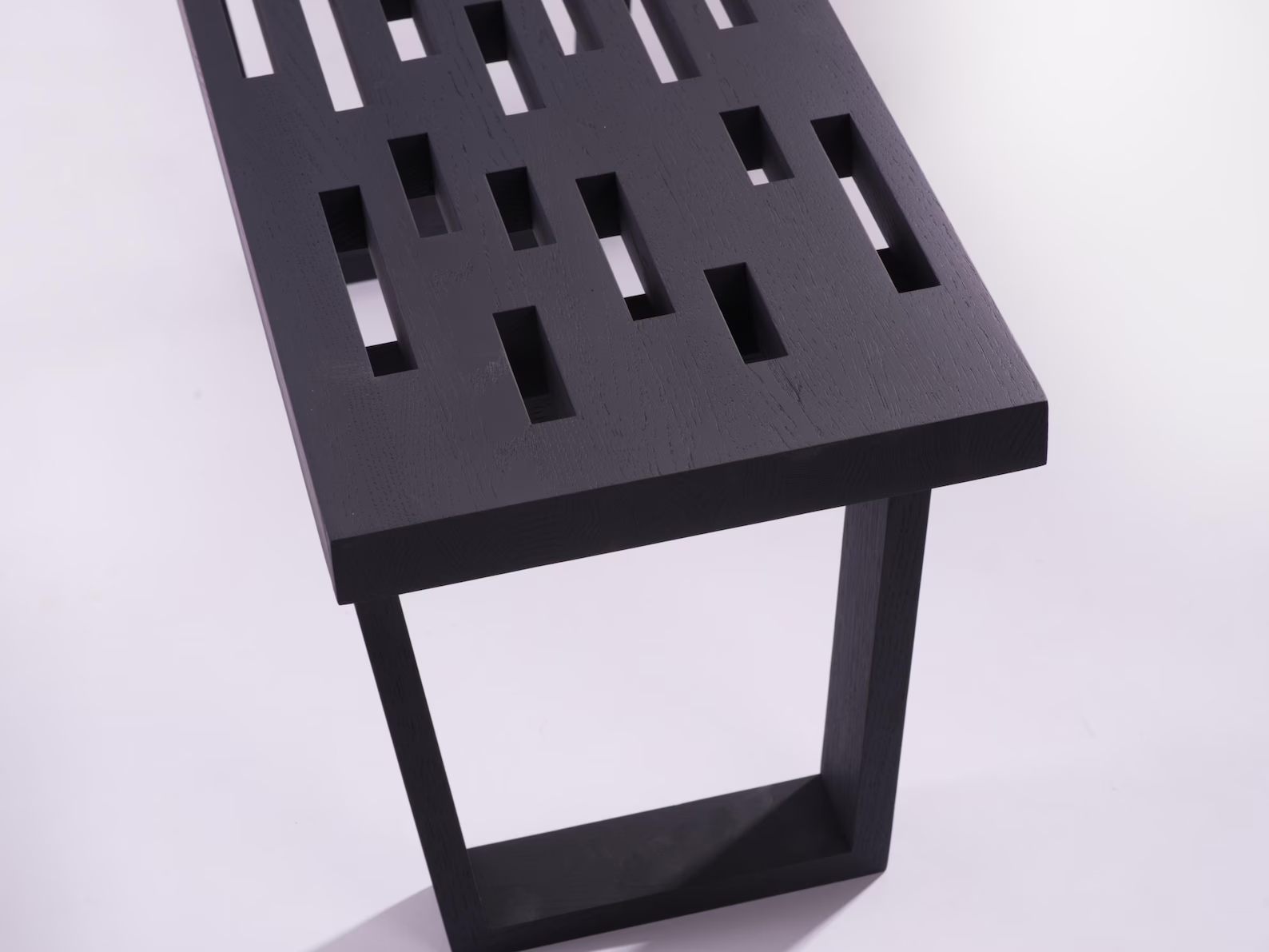 • Massive Eiche: Jedes Holzteil wird sorgfältig nach Haltbarkeit und Maserung ausgewählt. Trotz der Ebonisierung bleibt die natürliche Struktur sichtbar und verleiht der Bank Tiefe und Eleganz.